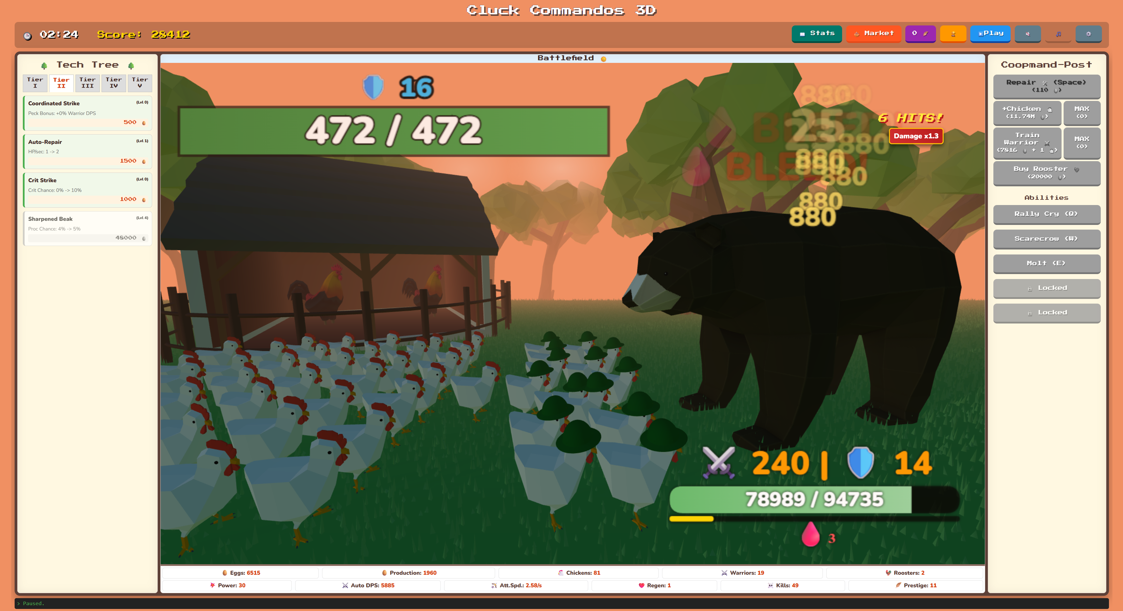 Cluck Commandos 3D mixes satisfying clicker mechanics with tower defense strategy. Manage your economy of eggs, train an army of chickens, and unlock advanced poultry technology to fend off waves of predators.